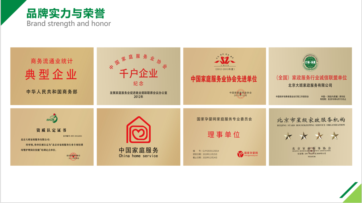 大班家政品牌創(chuàng)立于2006年,全國千戶百強(qiáng)企業(yè),北京四星級(jí)(最高星級(jí))服務(wù)企業(yè)主要為家庭、醫(yī)院提供月嫂、育兒嫂、高端保姆、家庭教師、病患照護(hù)等全品類綜合家政服務(wù),長期開設(shè)各項(xiàng)專業(yè)家庭技能培訓(xùn)。公司依托先審核后培訓(xùn),不培訓(xùn)不入戶的服務(wù)理念,十五年間為海內(nèi)外客戶提供了高品質(zhì)服務(wù)。